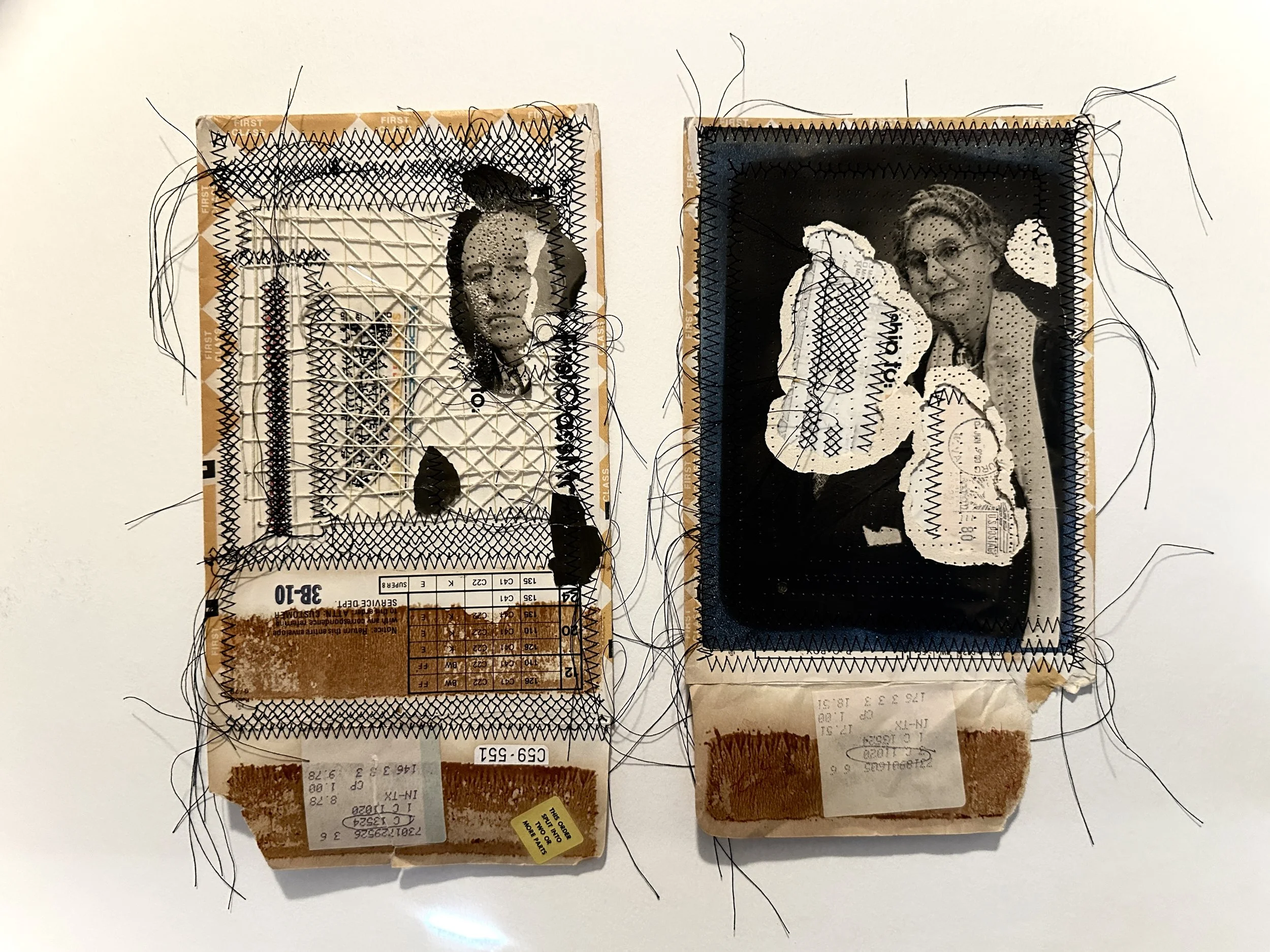 Mixed Media ~ photo print folders, black and white photography, string, thread, ink 6×8