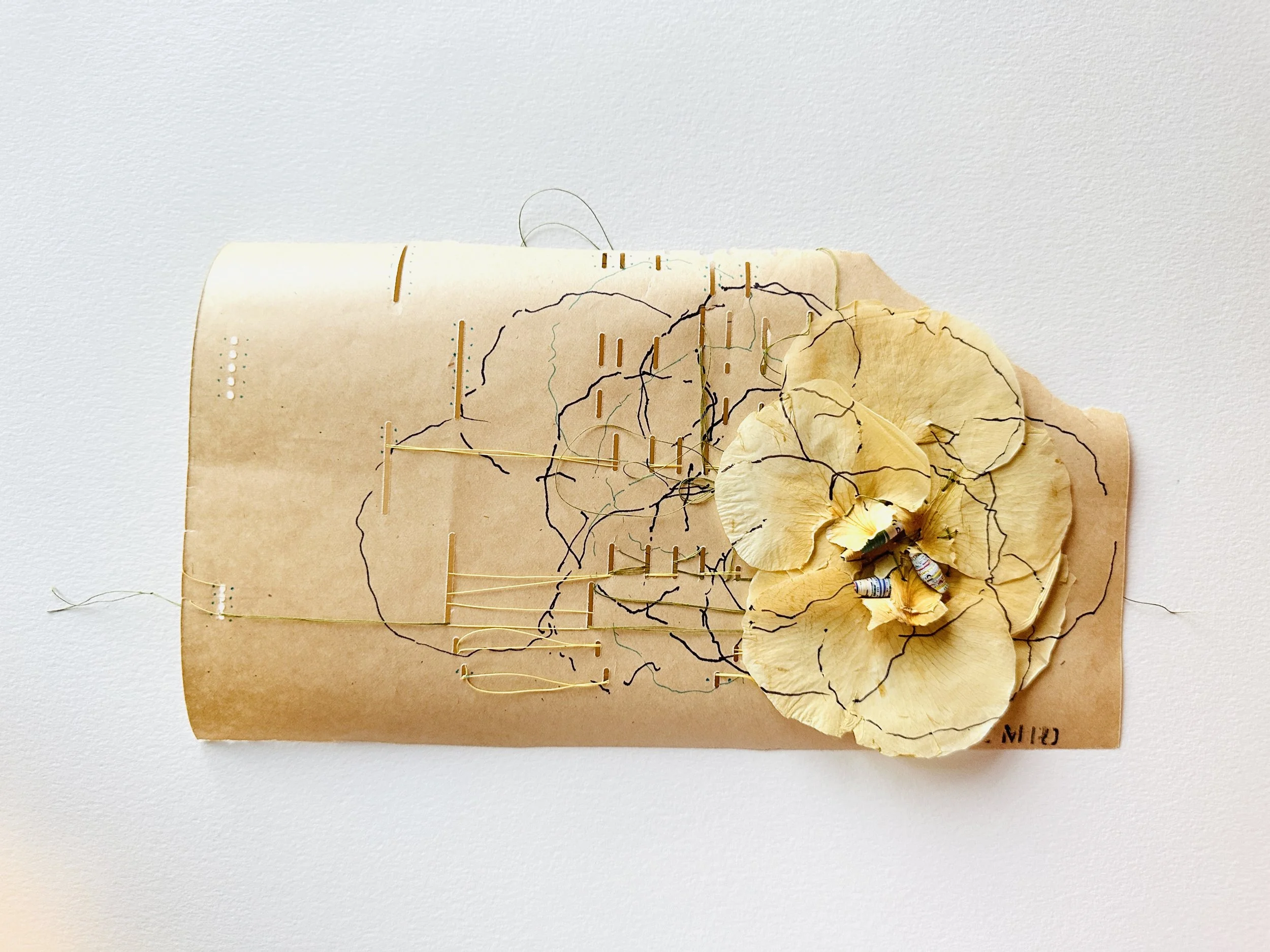 Mixed Media ~ player piano paper, dried flower, paper beads, ink, thread, 6×9