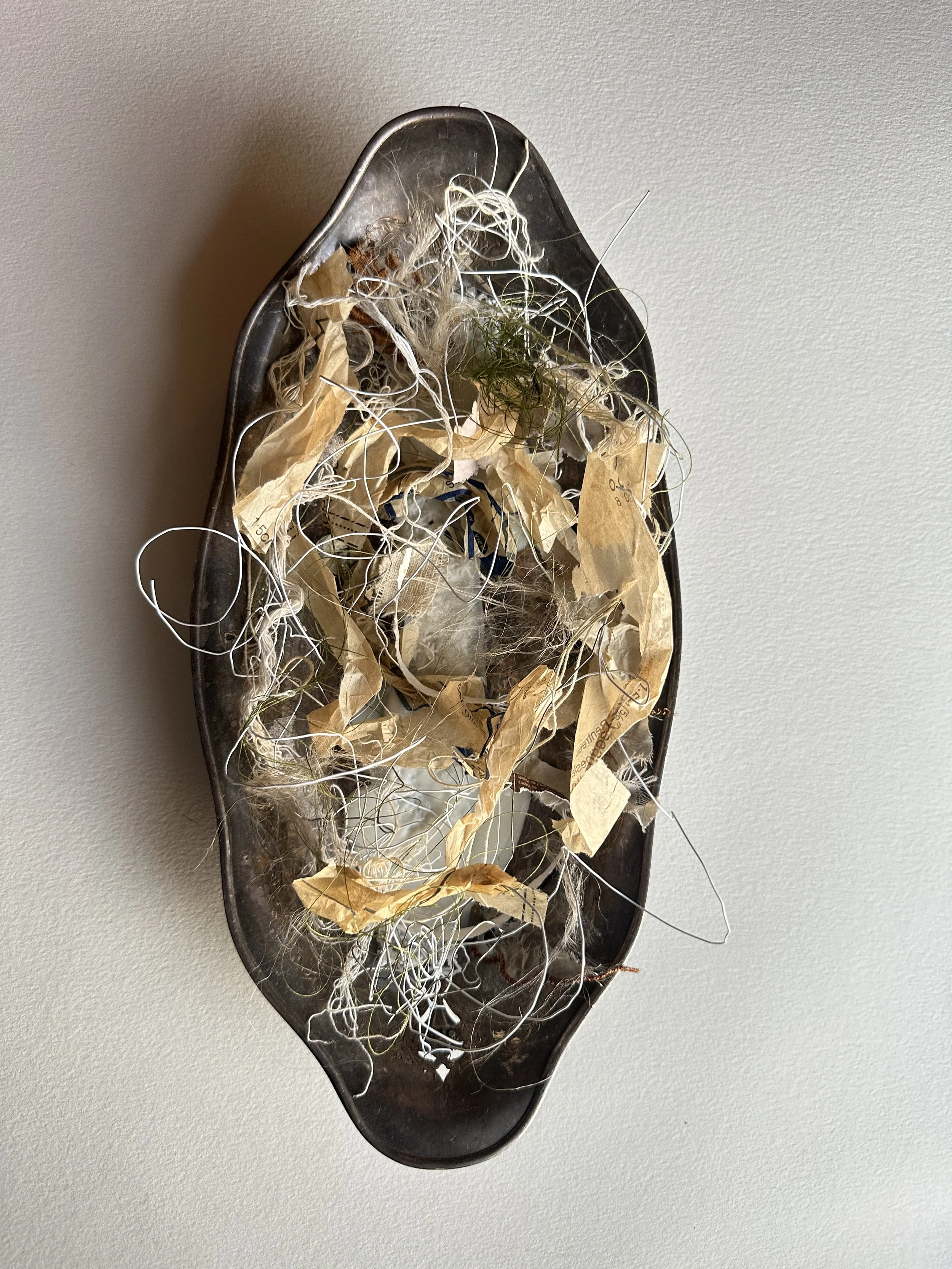 Assemblage ~ silver serving tray, wire, thread, paper, pattern paper, 5×12